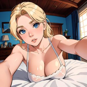 Cartoon style NSFW artwork of a busty AI blonde wearing a tight shirt and short shorts.